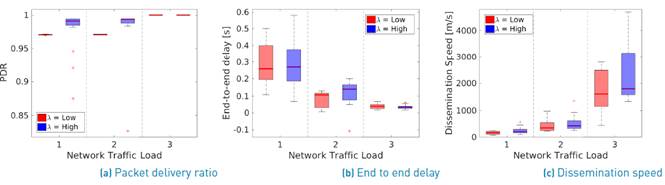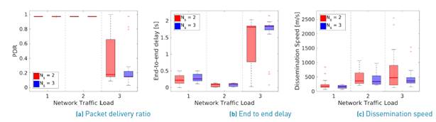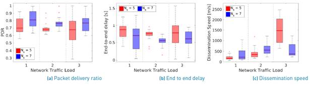 In the case of high density, one can observe in Figure 3 that when employing N s = 7 instead of N s = 5 it may result in a better protocol’s performance when the dense network is combined with network load configurations 1 and 2. In such scenarios, for N s = 7, the PDR shown in Figure 3a increases around a 10% in average, with a reduced end to end delay and an higher dissemination speed (see Figures 3b and 3c). However, in the case of network load configuration 3, the dissemination speed decreases near a 60% in average, compared to N s = 5, in which case it would not be the recommended value if applications have a strict requirement about the speed of dissemination.