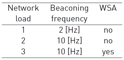 • Wave Service Advertisement messages (WSA) with frequency of 1 Hz. These messages are included to simulate background traffic on the network corresponding to various on-route services (i.e., traffic from other safety applications). They are additional load to the beaconing that operates permanently.