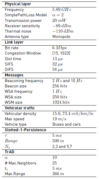 We executed 20 runs for each configuration scenario, for a total of 320 simulation runs. Table 2 shows the details of the parameters used in the bidirectional simulator VEINS [47] employed for this evaluation.