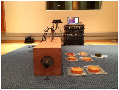 Due to the lack of a Reverberant room, and the lack of prime material for the elaboration of enough huge samples (required for the determination of the absorption coefficient through the ISO 354 standard), an alternative method -where the reverberation time was measured in an empty room (non-normalized), following the protocols stipulated in the ISO 3382-2 Norm [9]; the different configurations are introduced and then through the variation of the reverberation time, the absorption coefficient can be calculated.
