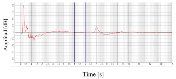 After obtaining the impulse response with the test-materials, then the impulse response measurement at free-field is performed. Because of the lack of an anechoic chamber, then the football playground is used. For this, the microphones are placed in front of the source at a 1.80 m height and replicating the previous measurements distances. Due to the fact, that the latency of the system is not constant, the measured impulse responses must be accommodated, adjusting to zero the impulse arrival time; in the same manner, it is convenient to perform signal windowing in order to eliminate the parasite reflections [Figure 10].