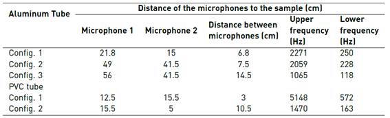 Two impedance tubes were used with different microphone configurations and lengths; the first tube has these characteristics: smooth tube in aluminum, 1 m long, with a 10.16 cm internal diameter, and a 5 mm thickness. The second one is a 60.5 cm PVC tube, with 10.16 cm in internal diameter and a 5 mm thickness. The configurations in each of the tubes are shown in Table 2.