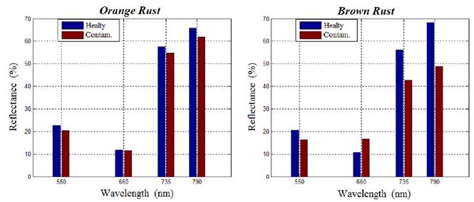 Using the Corona Plus Remote spectrometer and the samples of sugarcane leaves contaminated with brown rust and orange rust, we obtained the spectral reflectance curves that are shown in Figure 4. For healthy leaves, the low spectral reflectance in the portion of the blue (450 nm) and red (670 nm) bands is observed in Figure 4, due to the strong absorption by the leaf pigments (mainly chlorophyll). On the contrary, a peak of reflectance in the green portion (550 nm) is manifested. In the NIR region (700-1,300 nm), the high reflectance of the leaves can be seen, a characteristic in which cellular structures influence. This step type pattern between the visible regions of the electromagnetic spectrum and NIR is characteristic of green vegetation. Beyond the NIR, the short wave infrared region (1300 nm and above), an absorption peak at 1,450 nm can be perceived as a result of the presence of water. On the contrary, in the contaminated leaves there is a noticeable dispersion in the spectral curves, which is due to the fact that the contamination covers at most 50% of the leaf, and the readings of each curve are made randomly along the leaf between contaminated areas and not contaminated. The main difference between healthy and contaminated leaves is seen, for orange rust, in a decrease of ((() for the region between 750 and 900 nm (RE~NIR), and for brown rust in an increase of ((() in the region between 600 and 700 nm (R), a decrease of ((() in the region between 750 and 900 nm (RE~NIR), and an increase of ((() in the region between 1,400 and 1,600 nm. Furthermore, the difference between leaves contaminated with orange and brown rust is mainly seen in the R, RE~NIR and between 1,400 and 1,600 nm regions.