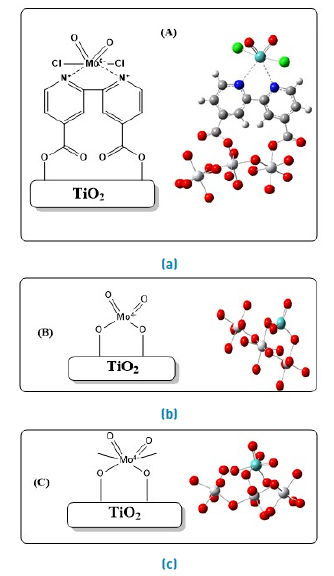 0.120 g of 4,4’-dicarboxi-2,2’-bipyridine acid (Aldrich, 70% wt) was dispersed on 40 mL of benzene and 0.102 g of 1,3Bis-trimethyl silil urea (Aldrich, 95% wt) and was stirred for 4h at room temperature. After, the solid was filtered and the excess of solvent was evaporated, a white solid called Bipy-Sil (A) was obtained. 0.5 mmol of A was dissolved on 40 mL of benzene and in a solution of 0.5 mmol of MoO2Cl2 in 30 mL of the same solvent, stirring for 4h at room temperature until the formation of a solid (B). Finally, 0.294 g of B in 30 mL of benzene was added to 1 g of dehydrated TiO2 (Degussa P-25) at constant stirring (400 rpm) for 12h. The resultant solid (BipyMoO2/TiO2, Figure 1a) was filtered and washed with benzene. As benzene is a very toxic solvent, other green solvents could be used for this application (Toluene, heptane or DMF that are less toxic and have been used for silylation of secondary amines) [15].