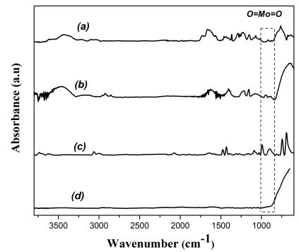 Figure 2 shows the IR spectra for all molybdenum materials. The presence of Mo-pyridine anchored on titanium oxide [Figure 2 a), was determined with the bands at 1395 cm-1 and 1797 cm-1 related to the C-O and C=O vibrations [26]. The presence of the bipyridine ligand was confirmed with the bands at 1591 cm-1 and 1797 cm-1 associated with the C=C and C=N vibrations [27, 28] and the signals at 940 cm-1 and 915 cm-1 corresponding to the symmetric and asymmetric vibrations of the MoO2 group, respectively [29]. The molybdic acid supported on titania [Figure 2 b) shows bands at 500 cm-1 and 600 cm-1 due to TiO2 while that OH group present bands at 1620 cm-1 and 3100 cm-1 (related to geminal and terminal groups of the titanium oxide) [30]. The dioxo-Mo compound show bands at 894 (asymmetric) and 945 cm-1 (symmetric) and at 721 cm-1 associated with the Mo-O stretching vibration [31, 32]. On the other hand, The MoO3/TiO2 [Figure 2 c) system presents bands at 867 and 831 cm-1 [32] related to the symmetric and asymmetric vibrations of the MoO2 group, respectively [30].