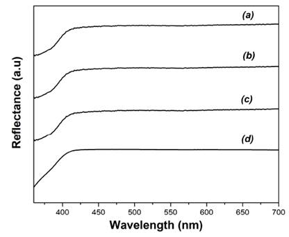 Figure 3 UV-Vis spectra of Mo heterogeneous catalysts: a) BipyMoO2/TiO2 b) AcMo/TiO2 c) MoO3/TiO2 d) TiO2 catalysts