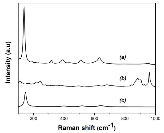 Figure 4 shows the Raman spectra of the AcMo/TiO2 and MoO3/TiO2 catalysts. AcMo/TiO2 [Figure 4a) presents bands at 958 cm-1 related with Mo=O vibration, 950 cm-1 associated with the symmetric vibration of Mo-O-Mo group, symmetric bending at 689 cm-1 and the deformation of Mo-O-Mo at 249 cm-1 [37, 38]. Molybdic acid supported on TiO2 presents the anatase phase of TiO2 signals due to vibrational modes Eg, B1g and A1g at 136, 322, 397, 517, and 639 cm-1 [39, 40]. Also, a small signal is observed at 962 cm-1 that corresponds to the Mo=O bond stretch. In the case of the MoO3/TiO2 catalyst [Figure 4b), a characteristic band at 114 cm-1 related to the vibrational mode of Ti-O (Eg) is present. Bands at 125 cm-1(B3g), 157 cm-1 (Ag, B1g), 663 cm-1 (B2g, B3g), 195 cm-1 (B2g), 217 cm-1 (Ag), 244 cm-1 (B3g), 289 cm-1 (B2g, B3g), 335 cm-1 (B1g, Ag), 336 cm-1 (Ag), 469, 993 cm-1 and 816 cm-1(Ag, B1g) associated with the symmetric vibrations Mo=O, Mo-O-Mo (symmetric and non-symmetric vibration), Mo=O (terminal vibration) and the symmetric and non-symmetric vibrations of the MoO2 were also detected. In-situ Raman and IR spectroscopic studies suggest that dehydrated metal oxide species presents a M = O terminal bond (where M is V, Mo, or Cr) [41].