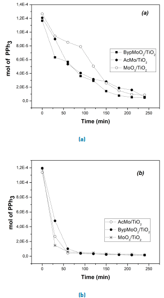 Table 3 indicates the specific rate constants estimated for each catalyst as a function of photonic flux. It can be observed that the catalytic system BipyMoO2/TiO2 presented the highest rate constant for both photonic fluxes. It could be associated with the conductive nature of the bipyridine ligand, which favors the electronic conduction between the dioxo-Mo and the semiconductor surface. It is correlated with the highest generation of the OPPh3.