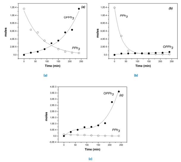 Figure 5 shows the effect of the radiation intensity in the concentration of PPh3 as a function of time. It can be seen that when increasing photonic flux, the phosphine transforms rapidly. Similar behavior is observed with the three Mo-catalytic systems. The photocatalytic support properties remain the same, which could be associated to the location of Mo species in the material.