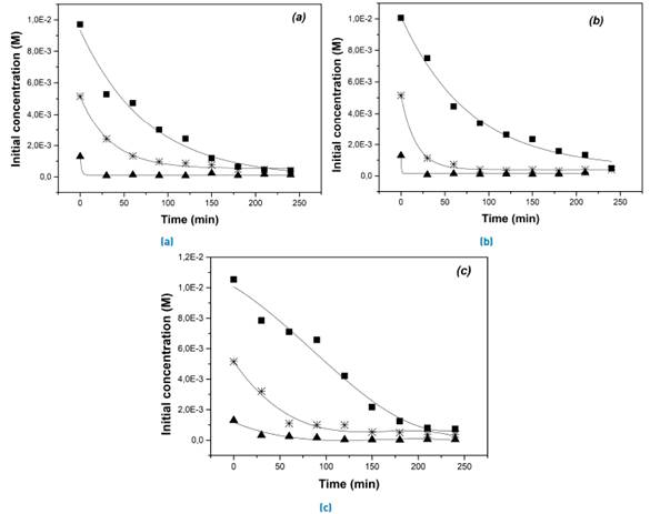 Figure 8 Effect of the initial concentration for Mo-heterogeneous catalysts: a) BipyMoO2/TiO2 b) AcMo/TiO2 and c) MoO3/TiO2. Reaction conditions: Room temperature, acetonitrile as the solvent (10 mL), constant stirring (450 rpm), and 60 mg of catalyst. (Symbols indicate the tendency of each initial concentration; squares=0.01 M, asterics=0.006 M and triangles=0.002 M)