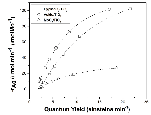 Estimation of the quantum yield was calculated using the Equations (1) and (2). Figure 9 shows the variation of the reaction kinetic constant as a function of the quantum yield for each Mo catalyst. Increasing the quantum yield, the initial reaction rate increases for all catalysts; nevertheless, the behavior is different for the MoO3/TiO2 material, where the increase of reaction rate is slowest; this fact could be associated with the amount of Mo. As for both BipyMoO2/TiO2 and AcMo/TiO2 catalysts, the same amount of Mo was added, a similar quantum yield behavior was achieved. Other reason for this fact could be associated with the variation of the reaction rate, the photonic flux and the absorption coefficient, which are associated mainly with the TiO2 support. It was assumed that only TiO2 contributes to the photocatalytic properties of the material, and besides, that other properties are considered constant (scattering and absorption coefficients). The quantum yields are lower than 25 Einstein min-1; the reaction rate appears to be the same for the three catalysts and by increasing the quantum yield, the reaction rate increases exponentially for all materials.