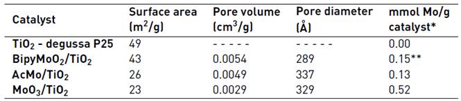 The specific area BET (Brunauer-Emmett-Teller) and the pore volume were determined using the adsorption-desorption isotherms of N2 in a Micromeritics 3 flex equipment at 77 K. Samples were degasified at 523 K for 30 min previously to the analysis. FTIR spectra were taken in an infrared spectrometer Bruker tensor 27 using a NaCl cell at 32 scans. To estimate the amount of anchored complex, TGA was performed using a thermogravimetric analyzer model 5500, with a heating rate of 10°C/min and a nitrogen atmosphere from 298 K to 1073 K. UV-Vis diffuse reflectance measurements were acquired in a Shimadzu UV-Vis RD spectrometer model 2401. For the Raman spectra, an Evolution Horiba confocal microscope was used, with 10x objective, 2s integration time and 10 accumulations. Atomic absorption was performed to determine the amount of metal in all catalysts. For this, 50 mg of each material was dissolved on a mix of HF/HCl/HNO3 and measured in an atomic absorption equipment Philips PU9100X model. The powder XRD was not included because of the quantity of each Mo catalyst is low and only detected phases anatase and rutile of TiO2.