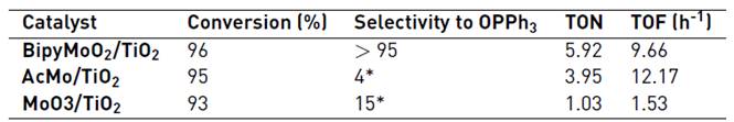 Reaction conditions: 0.01 M of PPh3 in acetonitrile (10 mL), 60 mg of catalyst, 450 rpm at room temperature. Conversion and selectivity were calculated at 240 min. TON was calculated as mmol of PPh3 per mmol of Mo (t=30 min). TOF was taken as the first derivate of TON with respect to time at saturation regime and instantaneous conditions (TOF=(dTON/dt) t=1 min). *Other Bipyroducts were obtained but not identified.