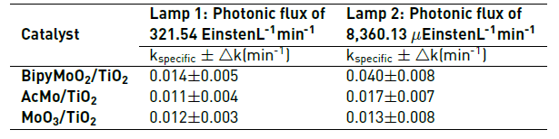 Given the observed correlation between the increase in photonic flux (8360.13 μEinstenL-1min-1), and the significant increase of the velocity constant, it can be seen that with this lamp, the kinetic constant is almost four times higher than the other one. In the case of the AcMo/TiO2 and MoO3/TiO2 catalysts, there is no noticeable change when increasing the photon flux, which may suggest that the oxidation mechanism is different.