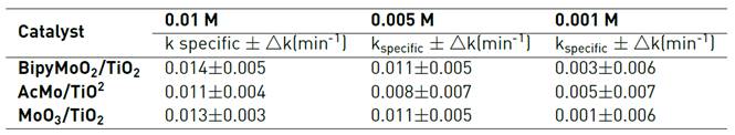 It was observed that the BipyMoO2/TiO2 catalyst showed that the rate constant is a function of the concentration. The activity of AcMo/TiO2 changes slightly with the initial concentration, and its value does not increase significantly as a function of concentration. At the same time, in the other two cases, the specific constant varies significantly. When the concentration is 0.01 M, the constant presents a maximum for BipyMoO2/TiO2. In contrast, for the concentration of 0.005 M, the kinetic behavior was higher for MoO3/TiO2, perhaps associated with its higher concentration of Mo.