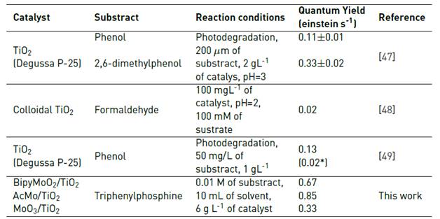 As no detailed kinetics have been reported, the current study shows references values of quantum yield (at different conditions) of Mo catalysts supported on TiO2, characteristic of photocatalysts used in different applications. As can be seen in Table 5, all heterogeneous catalysts present a quantum yield in a range between 0 and 0.9 Einstein s-1, being our system AcMo/TiO2, the higher as compared with the other materials. It is essential to highlight that in all cases, only TiO2 was used. The lowest value was achieved for the colloidal TiO2 used for the degradation of formaldehyde (0.019). Similar yields were obtained towards the degradation of phenol with TiO2 (Degussa P-25) (0.11-0.1275). Also, the quantum yield obtained for the MoO3/TiO2 catalyst showed the same value that TiO2 (Degussa P-25) used for the degradation of 2,6-dimethylphenol.