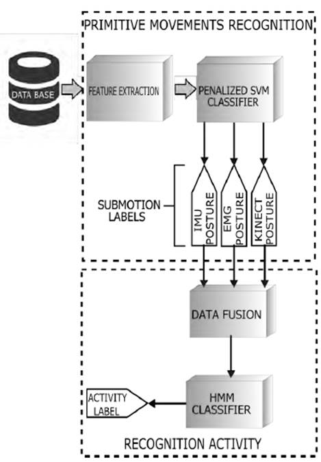 Figure 1 shows the methodology used for human physical activity recognition, mainly based on the work shown in[16]. The method starts with the identification of the primitive movements that later determine the activity performed according to the coding or sequence of the sub-movements. In turn, the model controls a task based on the execution of a sequence of simpler sub-tasks through a hybrid model between HMM and SVM, as is pointed out by[22]. This means that the SVMs segment the input data, and the HMMs use the output of the SVMs to determine the most probable sequence regarding time; thus, the methodology allows the execution of new actions according to a set of known movements. Moreover, it is possible due to the characteristics of the support vector machine to classify multidimensional data and to identify the HMMs ability when they operate with temporary sequential data[12, 22, 23]. It is important to point out that the HMM allows decoding the labels computed by the penalized classifier of micro-movements (sub-activities) and then reconstructing and recognizing the physical activity. Modern deep learning methods have been introduced to identify human physical activities achieving good findings when compared with classical techniques. However, they have been considered under a procedure that classifies the movement first and predicts the activity later, giving context to the movement. The foregoing disagrees with the approach to classifying human activities by primitive movements since the merged micromovement space is small, discrete, and inhomogeneous[24].