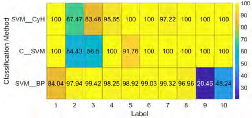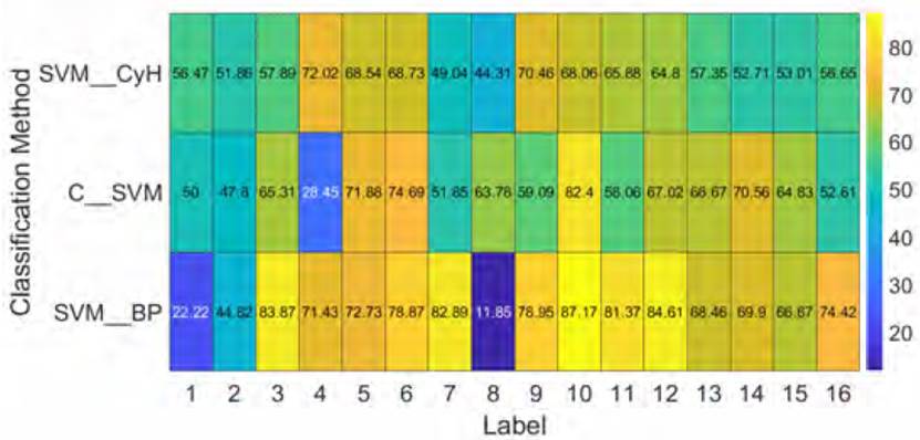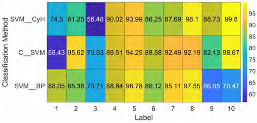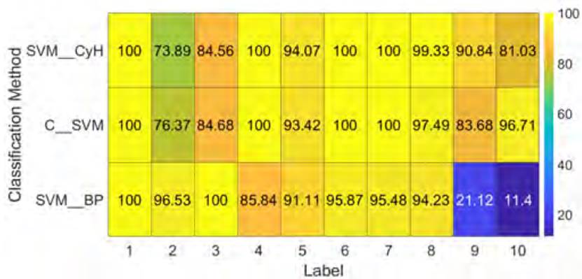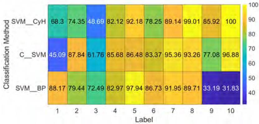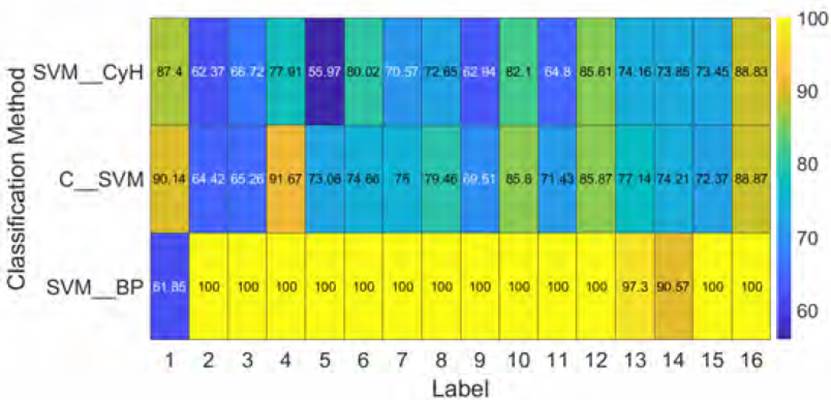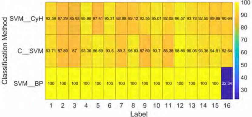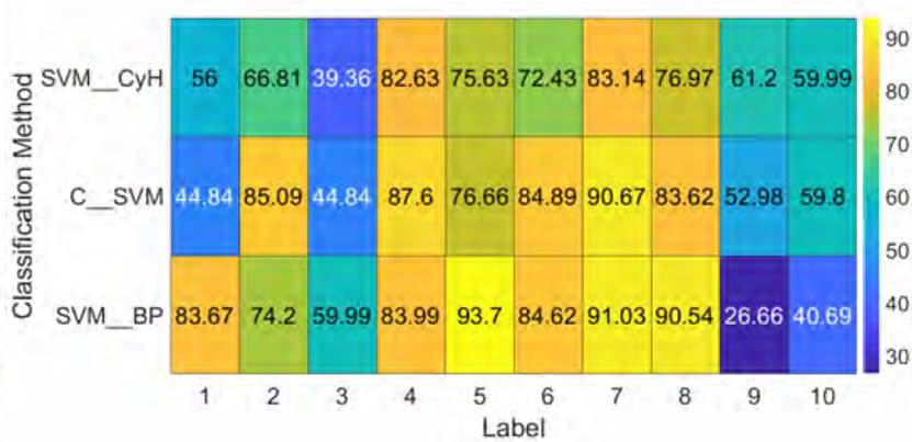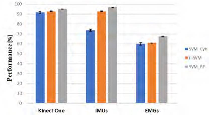Figure 7 shows the results obtained in the identification of primitive movements using the Kinect One® modality. A high performance of the experiments is evidenced, reaching efficiencies higher than 90%. In general, it should be noted that the SVM-BP method presents better performance than the one obtained with SVM_CyH. However, class 16 (axis of the abscissa) presents a low yield close to 20%. On the other hand, the C-SVM strategy shows a more stable behavior with a success rate greater than 90%. Figure 8 shows the results obtained for the primitive movements classification using the IMU sensor network. The penalized strategies (C-SVM and SVM_BP) have a performance value higher than 90% of accuracy. On the other hand, it is evident that these have a better performance than the one computed by SVM_CyH. It is highlighted that the SVM_BP method presents the highest efficiency with a success rate of 96.86% ± 0.01%. Figure 9 shows the performances of the classifiers by using the EMG sensor mode, where a low performance in comparison with those obtained in Figures 7 and 8 was observed. In summary, the SVM_BP method presents a better performance with 67.51 ± 0.01%. However, class 8 showed a low percentage of success of 11.85 ± 0.01%, which suggests the inability of the classifier to detect it. Although this result is not adequate, the other methods also show a similar trend of low efficiencies. This could suggest that the extraction of characteristics under this modality may not be representative. Although it is not possible to obtain a competitive detection with the EMG sensor modality, it is inferred that the penalized strategies manage to improve the performance of the classification with respect to the non-penalized model SVM_CyH. On the other hand, Figures 7, 8, and 9 show better performance under the SVM_BP paradigm.