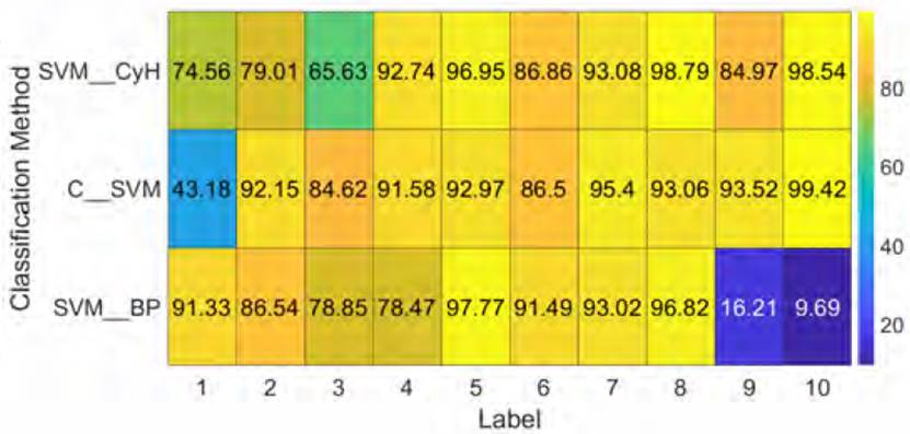 Figure 16 shows that the fusion of these two sensor modalities allows attaining a performance higher than 84%, where with activity 10 under the HMM_CyH and HMM_C methods, efficiencies greater than 98% are achieved, similarly with the HMM_BP strategy it stands out a yield close to 100% with the label 8.