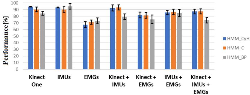 Kinect One®, IMUs, EMGs, Kinect One ® + IMUs, EMGs, Kinect One® + IMUs, Kinect One®+ EMGs, IMUs + EMGs, Kinect One®+ IMUs + EMGs.