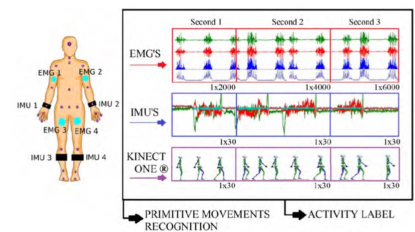 The recognition of physical activities aims to understand the actions carried out by people and how they interact with their physical environment. Some of the areas of application are videogames, robotics, rehabilitation, sports engineering, safety, among others[1-4]. In this way, the identification of activities seeks to track the human body’s movements[1, 4, 5]. Different sensor methods such as depth cameras, inertial measurement unit sensors (IMU), and electromyography sensors (EMG) have been used to detect physical activity. Kinect One® is one of the most widely used non-invasive devices for motion tracking. This device records different types of data, such as articulated points, depth maps, and video. However, it poses practical problems with partial occlusions of the objective[6-9]. In other works, IMU sensors have been used, which measure the acceleration changes generated by movement. Although there have been advances using this sensor method, the advances have been invasive and require a device network to track activity[10, 11]. Other approaches have used electromyographic sensors (EMG) to measure muscle contraction and extension and detect movement[7]. Although these methods are robust to partial occlusions, both IMU’s and EMG’s require more than one sensor to completely register different activities; this is made computationally in the algorithm development process[2-7]. Modern approaches suggest that an activity can be represented as a continuous sequence or actions, known as primitive movements. In other words, the segmentation of activities into simpler components that are configured in n specific order can be classified using a learning machine approach. Although this approach produces satisfactory findings, a large volume of information is presented when labeling the data, making this process extremely expensive. Furthermore, determining a window size is a subject of study, and there is no satisfactory solution for it yet[1, 6, 7, 12, 13]. In other case studies, a codebook has been built with the key positions for each of the activities. Unfortunately, this process can only be applied with the articulated points of the skeleton, which limits the usage of other sensor methods[13]. The combination of different types of sensor devices has been an emerging topic of study in the activities recognition. However, there are a few studies where the fusion of more than two types of multimodal sensor system is performed[14-16]. In state of the art, combinations such as Kinect One® + IMU, Kinect® + EMG, and EMG + IMU y Kinect One® + IMU + EMG are reported[6-16]. This method has been found to attain a more satisfactory performance with respect to the methods that mix one or two types of devices[17-21].