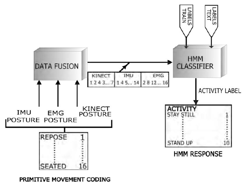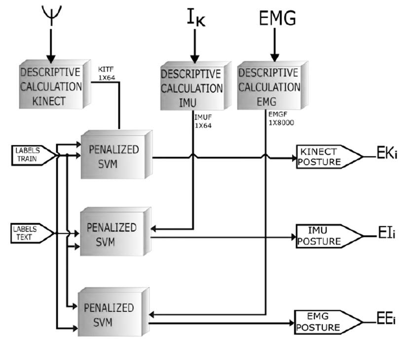 The work from[16] carries out the fusion of the Kinect One®, IMU, and EMG for the characterization of the movements through two redundant classifiers (SVM and a hidden Markov chain (HMM)) where efficiency greater than 95% in the detection of activities is achieved. Although satisfactory findings are computed, their computational cost is high, and the number of activities under study is limited, which does not allow evaluating the real scope of the method. On the other hand, the state-of-the-art reports difficulties in classifying primitive movements claiming issues in the labeling and overlapping the data. Therefore, a penalty paradigm is required in order to assign less weight to data that biases the model. For instance, some papers have achieved satisfactory findings in classification problems where overlapping conflicts regarding the data reported.