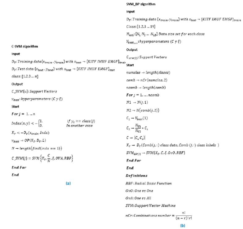 Three models of multiclass support vector machines with several classification strategies were used. Firstly, the C-SVC penalty method was used (see Figure 5a)[35]; secondly, the Weighted Binary SVM was implemented[36] (see Figure 5.b); and lastly, a classic SVM method was used. For all the models, a Gaussian kernel with a radius of 1x10-4 was established by coupling the database in section 2.2. In this case, it is preferred to penalize the data in the database because they present issues such as class overlapping and unbalance, in addition to the Kinect One® partial occlusions or auto-occlusions, or loss of connection in the acquisition systems of the signals from IMUs or EMGs, which affect the performance and efficiency of the classifier in the identification of the primitive movements[16-37]. For more details, refer to[22]. On the other hand, the specified value of