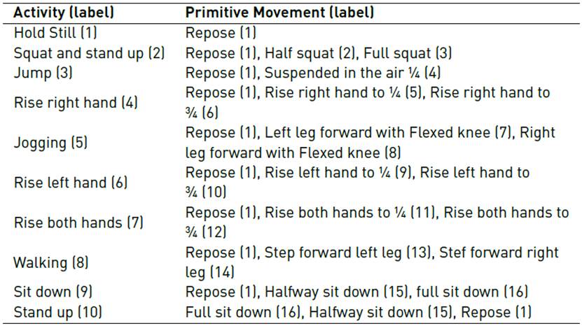 The second stage consists of labeling the activities as well as the primitive movements of the executed sequences. The first sequence was determined according to the ones presented in[1, 15, 16, 24, 25, 26]. Table 1 lists the 10 activities with their respective labels provided in this work. The data was retrieved from 12 participants (8 men and 5 women with 5 repetitions).