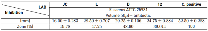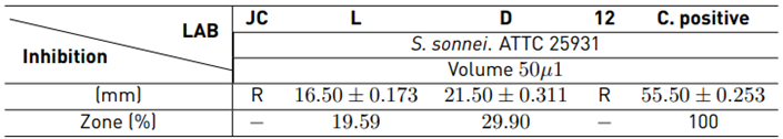 Organic acids in strains D and L inhibited Shigella sonnei ATTC 25931 with an inhibition zone of 29.90% and 19.59%, respectively. Metabolites from strains JC and 12 did not inhibit the pathogen Shigella sonnei. It was noted that each LAB produces different metabolites, and antimicrobial activity is considered to be strain-dependent and not a characteristic that is generalized across the LAB group. The positive control action is confirmed with 55.50 mm diameter halos.