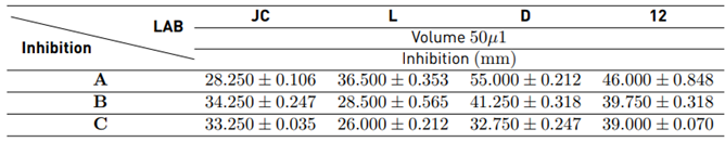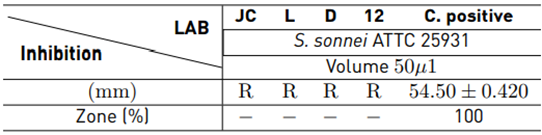Equation (1) below was used to determine the inhibitory capacity of LAB and their susceptibility to antibiotics [1].