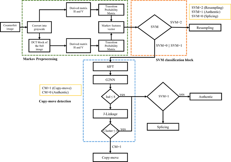 This proposed algorithm is divided into two parts: copy-move detection and Markov preprocessing that is used for resampling detection. In the proposed method, the main contribution is the identification of the type of alteration of a digital image either by copy-move, resampling, or splicing.