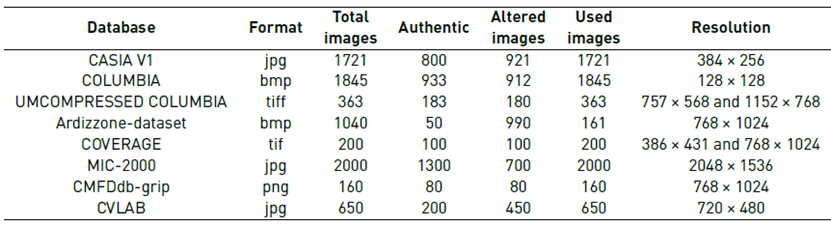 In order to evaluate the algorithm, the most well-known forgery image evaluation datasets for splicing, resampling, and copy-move were selected. The datasets selected for evaluating splicing were CVLAB [40], CASIA V1 [41], Columbia [42] and Uncompressed Columbia [43]. Ardizzone-dataset [45], Coverage [45], MIC-F2000 [38] and CMFDdb-grip [46] datasets were used for the evaluation of copy-move and resampling. A selection of datasets rich in formats, sizes, and quantities of images with different types of alteration were used. Table 2 shows the main characteristics of all the datasets that were used to evaluate the proposed algorithm, such as format, number of original images, number of altered images, and resolution. Taking into consideration all the datasets used for the study, a total of 7100 images were evaluated, of which 3666 were unaltered, 791 had resampling, 2213 had splicing, and 430 had copy-move alterations.