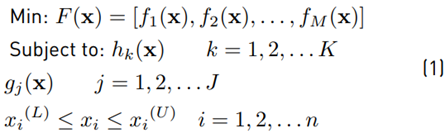 where, F (x) represents the vector of the M objective functions to be optimized. x = (x 1 , X 1 , . . . x n ) is a solution with n design variables. h k (x) and g j (x) are the equality and inequality constraints. x i (L) and x j (U) are the boundary limits of the decision variable x i . In the following, the fundamental concepts in multiobjective optimization are addressed.