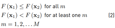 Pareto dominance is used to compare and sort the solution vectors x in a MOP. One vector solution x1 dominates another vector solution x2 (denoted as x1 ≺ x2) if and only if (in the context of a minimization problem) Equation (2) is satisfied [40].