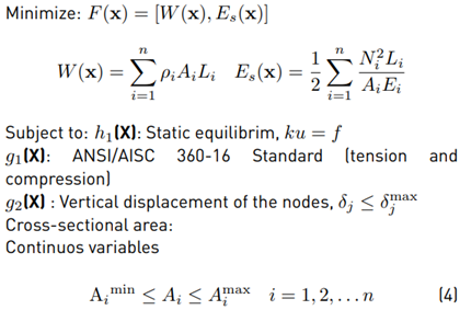 where A i , ρ i , N i , L i and E i represent the design variable area, material density, axial force, length, and elasticity modulus for the i element, respectively. K u and f are the global stiffness matrix, the nodal displacements vector nd the external nodal forces vector over the structure. δ j is the calculated displacement for node j and δ j max is the maximum allowable displacement. A i min and Aj max are the design variable Ai limits in the continuous nterval. ANSI/AISC 360-16 Standard [49] requirements for the design of tension and compression elements (without considering connection design and using the LRFD method) were used in this work and for further detail, the reader could refer to this Standard.