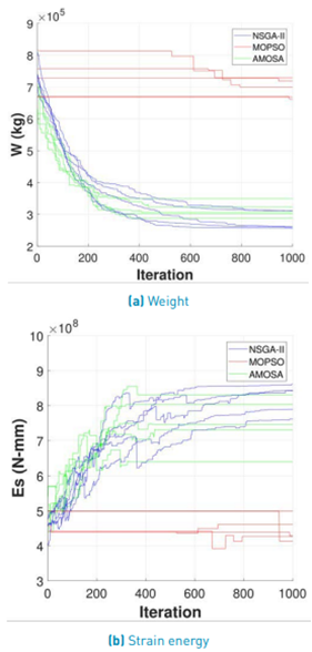 Moreover, Figure 14 shows the convergence of the extreme values (minimum weight and minimum strain energy) of the Pareto front during the 1000 iterations for each of the algorithms (NSGA-II, MOPSO and AMOSA) in each of the five runs.