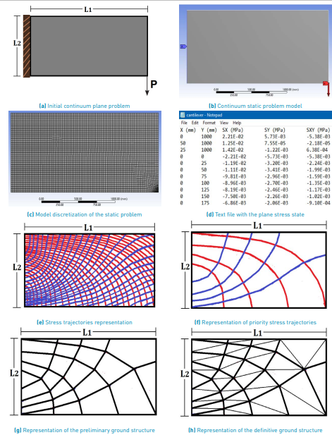 The static problem is solved using ANSYS® considering a homogeneous, isotropic material with elastic properties (see Figure 2b). A text file (.txt) (see Figure 2d) with the numerical information of the plane stress state (σ x , σ y and τ xy ) associated with the design domain discretization in Figure 2c is obtained.