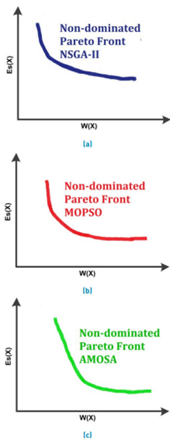 According to Figure 12, the best performing algorithm was NSGA-II, followed by AMOSA and MOPSO. The NSGA-II algorithm presents a Pareto front (for each of the five runs) with better convergence and diversity as generations (iterations) advance.