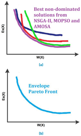 Applying the idea of combining the NSGA-II, MOPSO and AMOSA Pareto fronts, a single non-dominated Pareto front with the best solutions of the optimization process is calculated (see Figure 4a). In this work, this is called an Envelope Pareto Front-EVP (in analogy to the structural design concept of the envelope), as shown in Figure 4b.