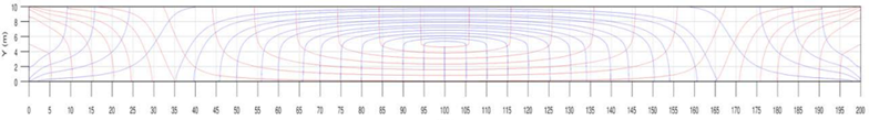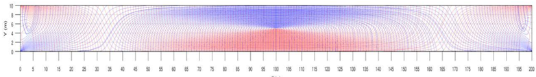 From the stress state numerical information, the stress trajectories σ1 (red) and σ2 (blue) were calculated in MATLAB®, as shown in Figure 8. The parameters used to calibrate the numerical method [41] were: IDW method as stress state interpolation technique, initial iteration point P = (10.0) m, step size r = 100mm and trajectory separation value a=1m.