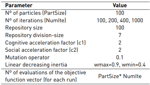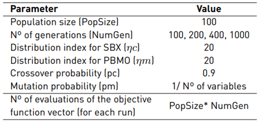 MOMAs are multiobjective optimization techniques oriented towards the direct computation of the Pareto front in a single run, simultaneously optimizing the individual objectives. However, the main disadvantage of these algorithms is the setting of additional parameters related to their functioning and a decrease in the resulting quality in the optimization process when the number of objectives increases. They are beneficial in problems with no information about preferences or priority of objectives [40]. Generally, they have adapted versions of the single-objective metaheuristic algorithms (e.g., Genetic Algorithm (GA), Evolution Strategy (ES), Simulated Annealing (SA), Particle Swarm Optimization (PSO), Ant Colony Optimization (ACO), Harmony Search (HS) among others). These techniques have been established as efficient optimization techniques to solve multiobjective problems. Because of their reliability, free derivative nature and wide use, in this work, the following three multiobjective metaheuristic algorithms were used: Non-dominated Sorting Genetic Algorithm II (NSGA-II) [37], Multiobjective Particle Swarm Optimization (MOPSO) [38] and Archived Multiobjective Simulated Annealing (AMOSA) [39]. The parameters used for each algorithm are presented in Section 5.2.
