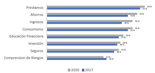 El Centro Global para la Excelencia en Educación Financiera, GFLEC (por sus siglas en inglés) y la Asociación Americana de Seguros y Rentas en América, TIAA (por sus siglas en inglés), desarrollan el índice P-Fin que mide la alfabetización financiera en los Estados Unidos con relación a las ganancias, el consumo, el ahorro, la inversión, los préstamos, la administración de la deuda, los seguros, la comprensión de riesgos y el acudir a las fuentes de información, como dimensiones fundamentales de la educación financiera (Lusardi et al., 2020). Este índice muestra que, aunque en 2020 las dimensiones analizadas fueron superiores al 2017, los valores en general aún son bastante bajos, lo que representa notas reprobables, lo que señala que desde antes de la pandemia la población ya era vulnerable desde el punto de vista financiero, incluso en mejores condiciones socioeconómicas como se muestra en la figura 3. En lo relacionado con la comprensión de riesgos asociados con adquisición y gestión de productos financieros, se muestra el menor número de aciertos por parte de los encuestados, con 39 % de respuestas correctas en 2020, una leve mejoría con relación a los datos de 2017, frente a preguntas como ¿sabe que es una tasa de mora?, o ¿sabe cuál es su perfil de riesgo?, que de manera genérica buscan identificar su acercamiento y entendimiento de los productos financieros generalizados como tarjetas débito y créditos.