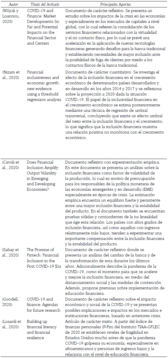 A pesar de que este artículo es anticipatorio y busca esbozar la escasa investigación existentes sobre la pandemia y las proyecciones de inclusión financiera como estrategia de recuperación, es posible destacar artículos académicos y publicaciones que además de evaluar impactos de las pandemias y crisis anteriores, presentan pronósticos acerca de cómo la COVID-19 generará consecuencias con relación a las afectaciones socioeconómicas, de mercados y de instituciones financieras. Dichas apreciaciones están enfocadas hacia aprendizajes previos, modelación, aplicación de las finanzas digitales, educación financiera y recomendaciones para la recuperación económica efectiva.