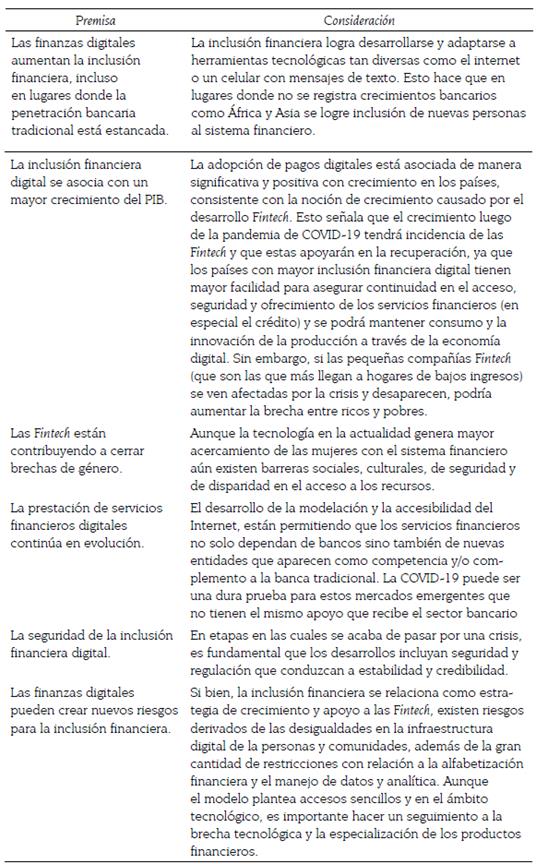 Sahay et al. (2020) en colaboración con el Fondo Monetario Internacional presentan un estudio en el cual afirman que en una muestra de 52 países y en una ventana de observación de 2014 a 2017, las finanzas digitales logran aumentar la inclusión financiera, incluso en lugares de África y Asia donde la penetración bancaria tradicional no presenta crecimiento, una vez que la inclusión financiera digital logra desarrollarse con herramientas tan simples como un celular con acceso a mensajes de texto. De este estudio presentado en 2020, se destacan varias premisas (ver tabla 2) que se tienen en cuenta sobre la evolución de la temática y los pronósticos y consideraciones a ser tenidas en cuenta en este momento, en el cual toma más relevancia el tema de la digitalización.