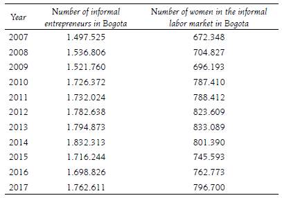 Table 2 Number of informal entrepreneurs and women in the informal labor market in Bogota