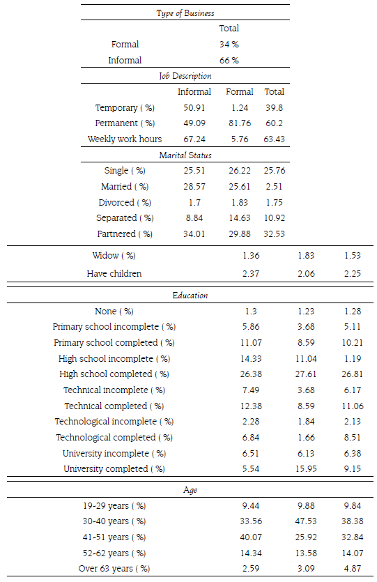 Among the primary findings of this research carried out in the city of Bogota, it was found that a significant proportion of the participants had inherited their occupation from their mothers, who taught their profession to their children as a means of earning a living. Regarding education, it was found that informal entrepreneurs have less formal education, work longer hours, and their hourly wage is higher than that of formal entrepreneurs, which may be related to their link to the informal labor market.