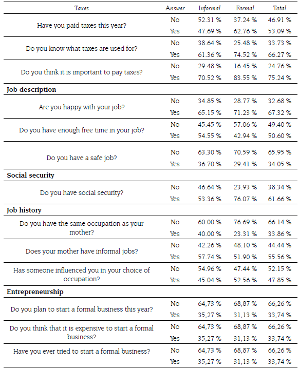 Attitudes towards taxation for participating women within formal and informal business are the same. In contrast to the approaches of the Legalist School, for the women in this research who have formal and informal jobs, paying taxes is of equal importance. However, women with formal jobs argue that they have paid 15 % more taxes, which may be due to the costs of legalizing work.