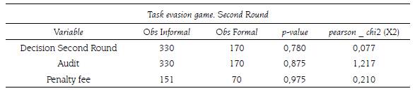 Regarding the Chi-square test of the second round, it is confirmed that at confidence levels of 95 % there are no significant differences between the decision to report true income and the formal or informal employment relationship of the participants (Table 6).