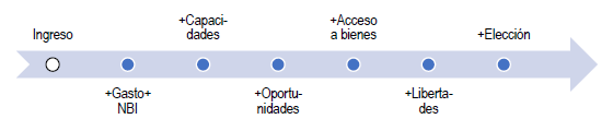 De esta manera, la medición de la pobreza se daría uniendo las variables de ingreso, gasto, necesidades básicas insatisfechas, capacidades, oportunidades, acceso a bienes, libertades y elección.