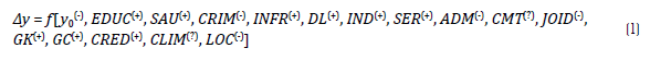Estas dotações incluem: a) qualidade da educação (EDUC) e da saúde (SAU), que podem aumentar a produtividade laboral e reduzir o absenteísmo (Mankiw, Romer e Weil, 1992; Andrade e Serra 1998; Miller e Upadhyay, 2000; Firme e Simão Filho, 2014); b) criminalidade (CRIM), cujo aumento tende a inibir empreendimentos locais (Divino e Silva Junior 2012; Diallo, 2018; Cox, North e Weingast, 2019); c) infraestrutura (INFR), que pode minimizar certos custos de produção (Andrade e Serra 1998; Esfahani e Ramírez, 2003); d) demanda local (DL), que tende a atrair empresas interessadas na mão-de-obra e no consumo potencial, e pessoas, em busca de emprego (Andrade e Serra 1998; Fujita, Krugman e Mori,1999); e) viés produtivo (Kaldor, 1966; Andrade e Serra 1998), onde sustenta-se que a indústria (IND) seria crucial às cidades mais pobres, enquanto o setor de serviços (SER) promoveria o crescimento das mais ricas (Veríssimo e Saiani, 2019). A dependência da administração pública (ADM), que supõe-se um entrave, também foi avaliada; f) concentração do mercado de trabalho (CMT) (Fochezatto e Valentini 2010; Sarmento e Nunes, 2015), que pode elevar os ganhos de escala (Madiedo et al, 2012) ou reduzir os encadeamentos produtivos (Miller e Blair, 2009); g) fatores demográficos, segundos os quais populações mais jovens (JOID) seriam menos experientes/produtivas e mais propensas à rotatividade no emprego (Crenshaw, Ameen, e Christenson, 1997; Mankiw, 2010).